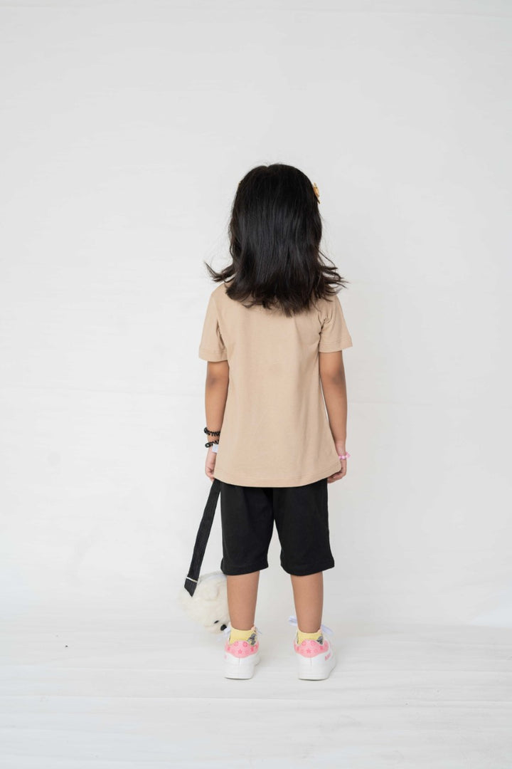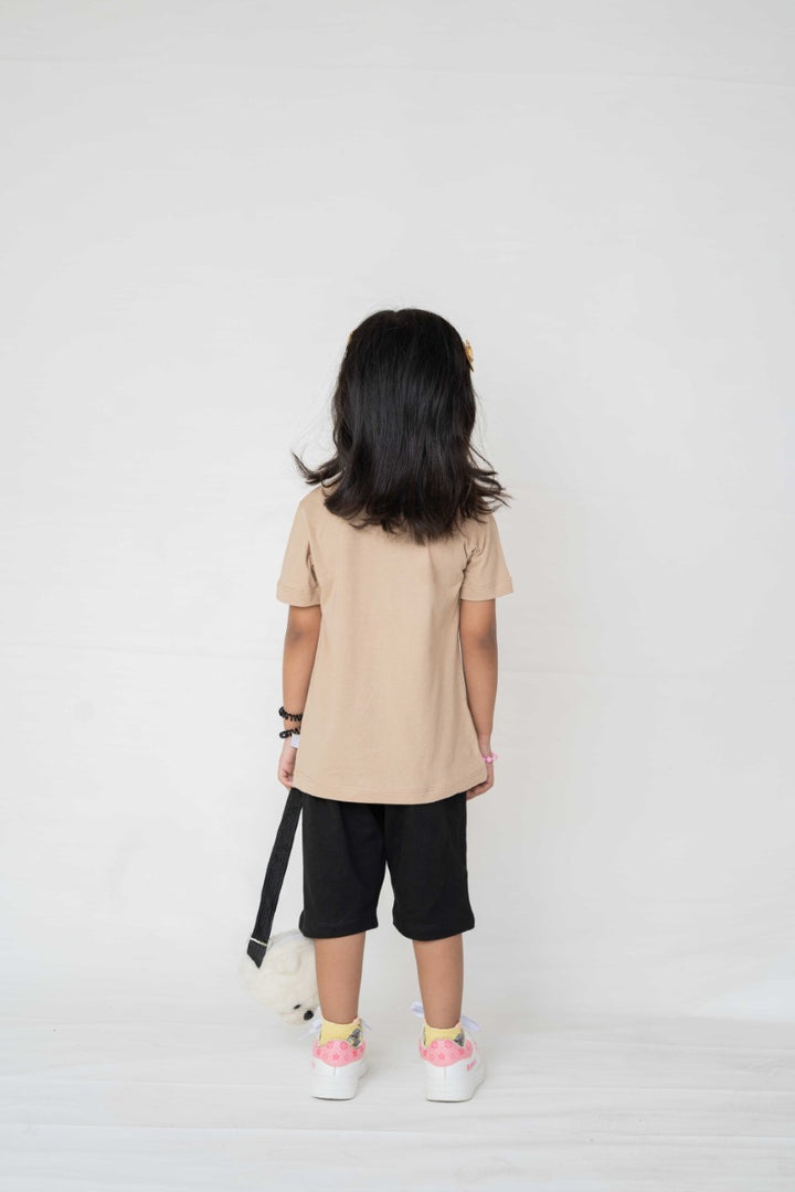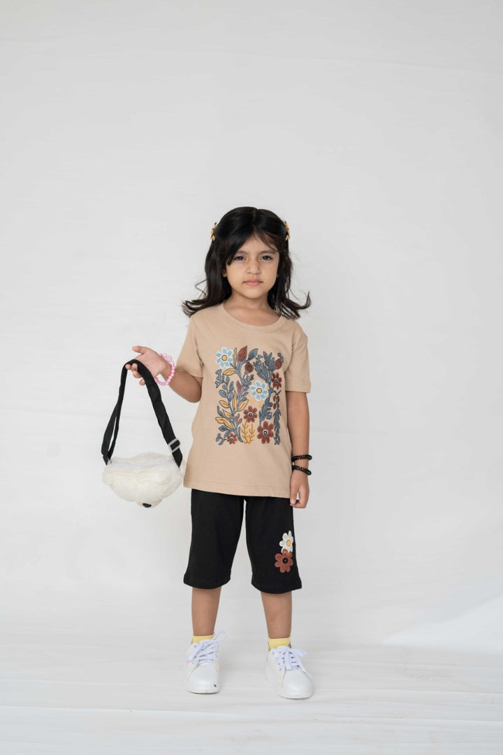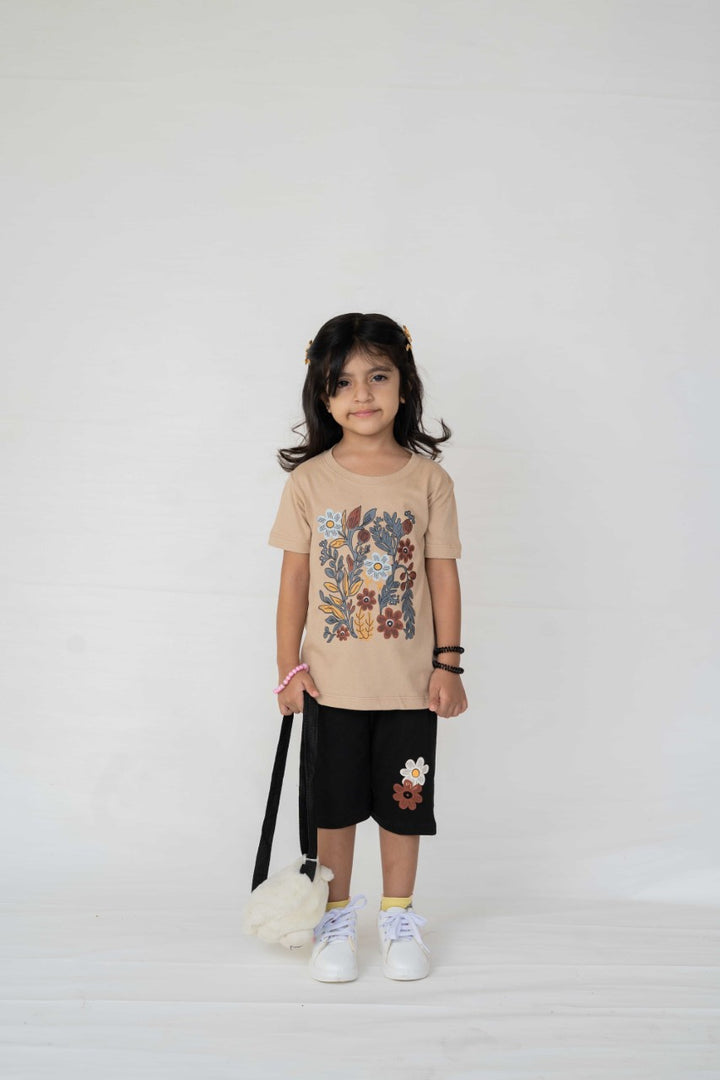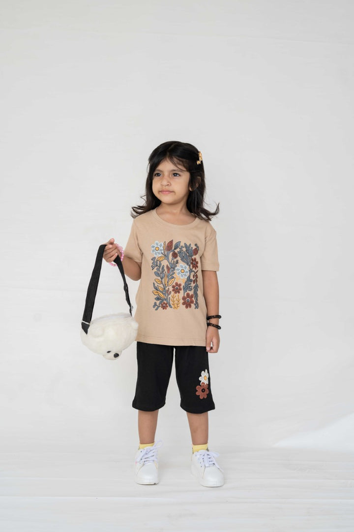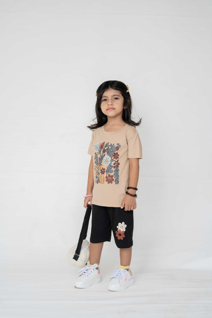 Let your little one bloom in style with our beige and black set that features a delightful garden-inspired floral print on both the t-shirt and shorts.