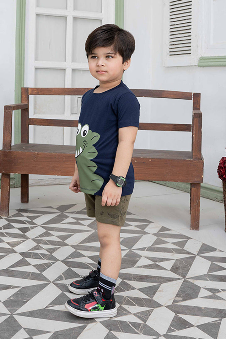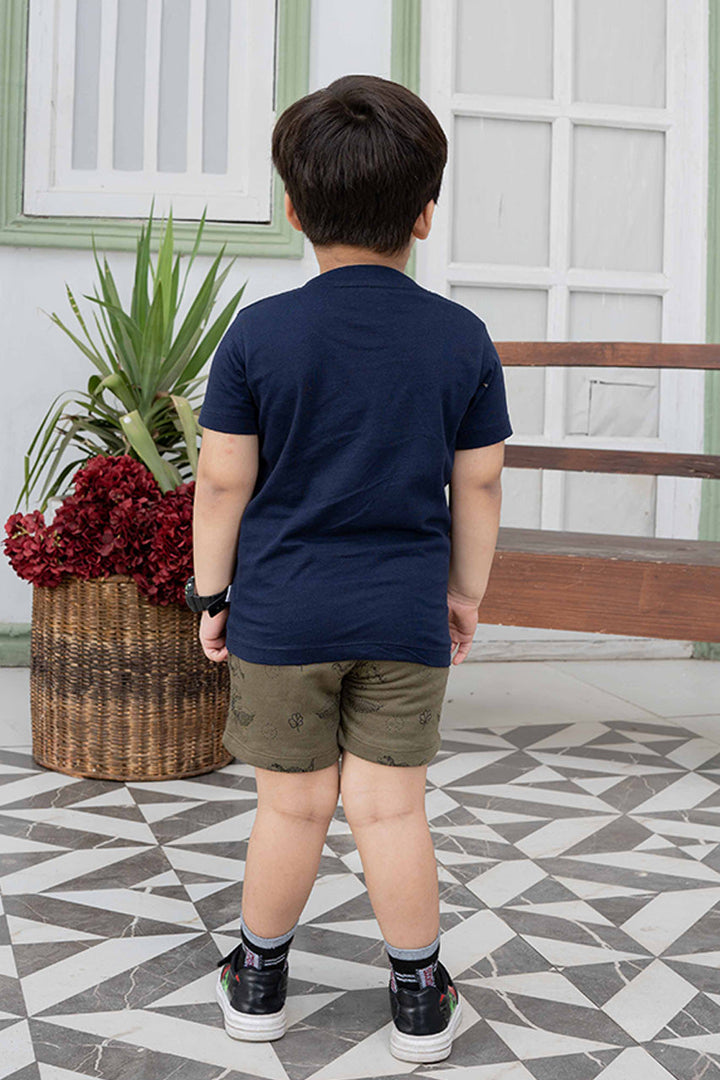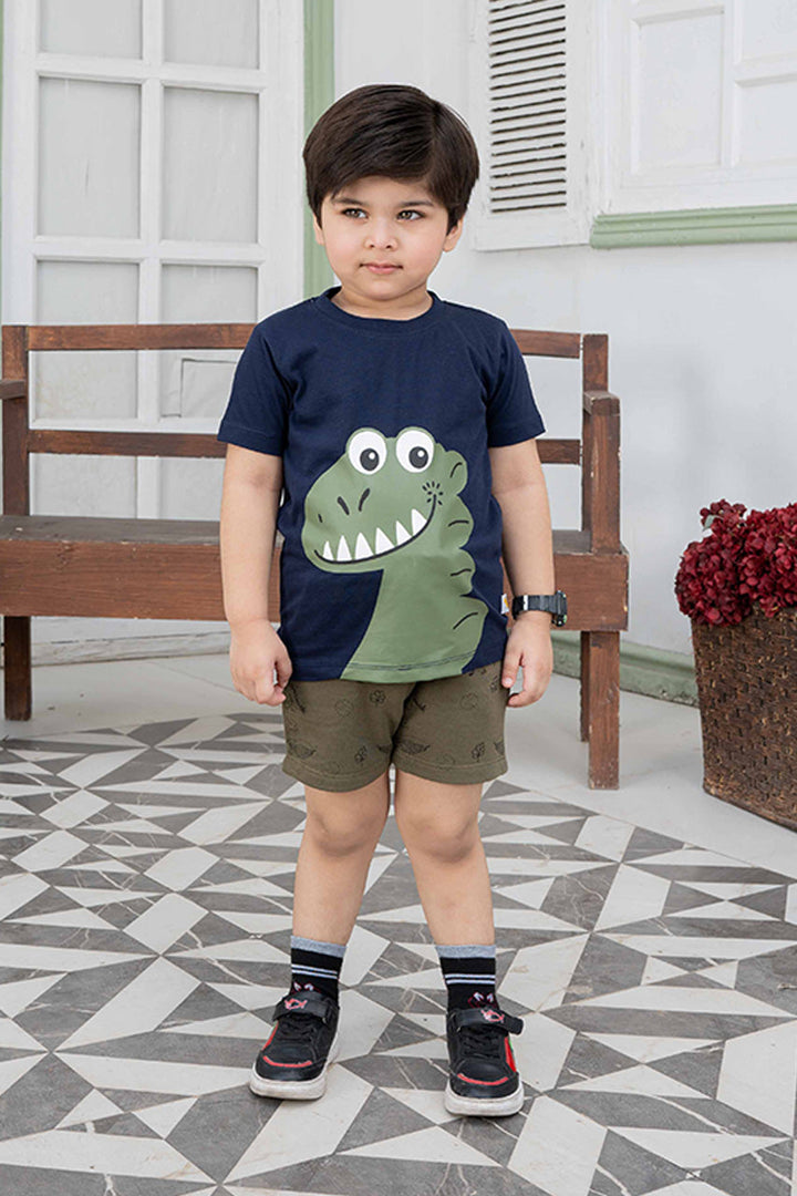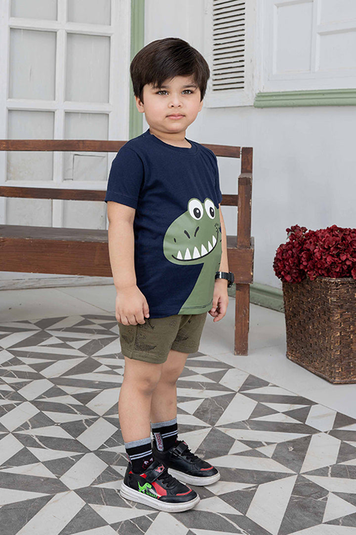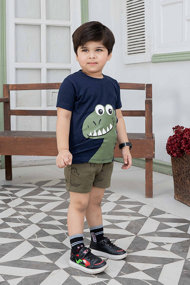 Unleash the roar of fun with our Dino dude adventure set – a must-have for your little explorer! Featuring a bold navy blue t-shirt with a friendly dinosaur graphic and matching olive green shorts printed with playful fossil patterns, this outfit is perfect for curious toddlers with big imaginations.
