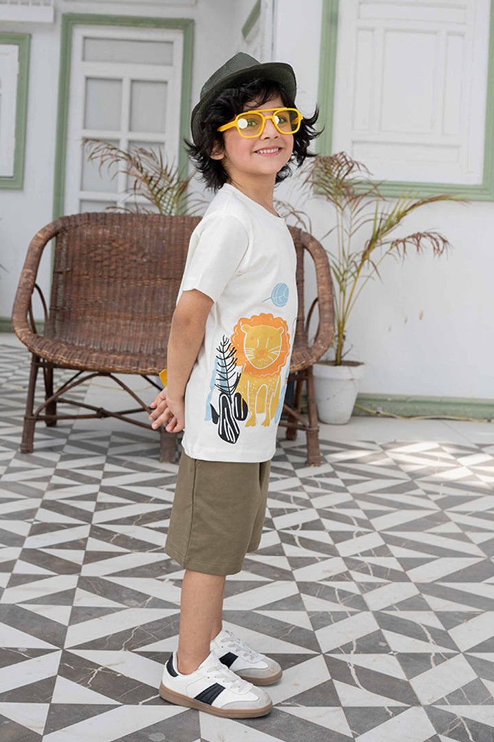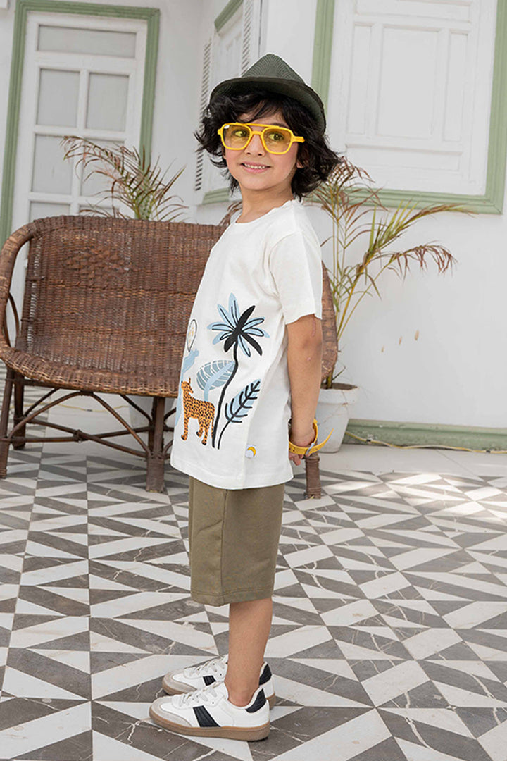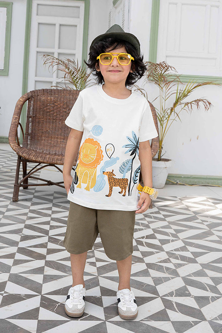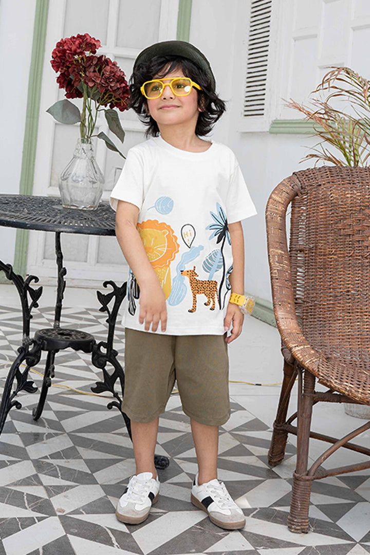 This is a two-piece children's clothing set featuring a fun and playful jungle theme: