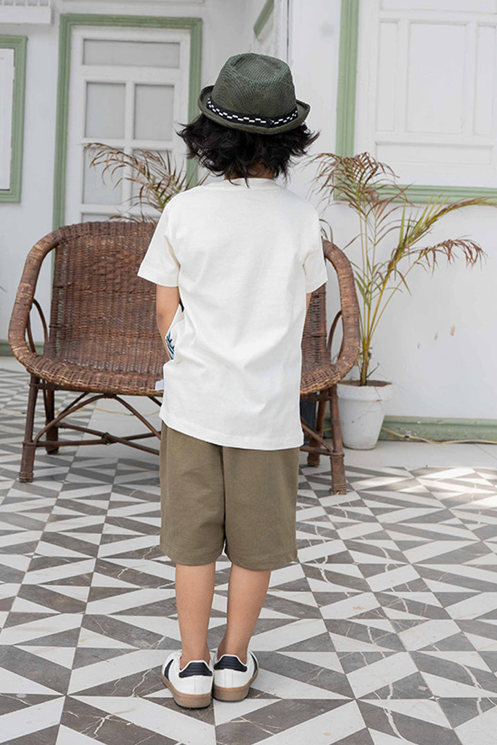 Shorts: Olive green shorts with an elastic waistband and a black drawstring for adjustable fitting. The fabric is comfortable and breathable, suitable for warm weather.