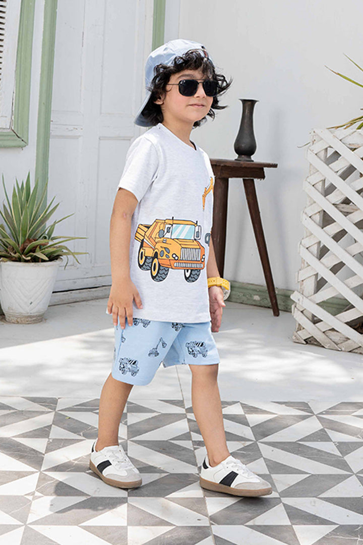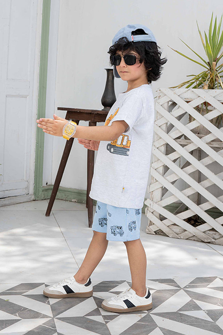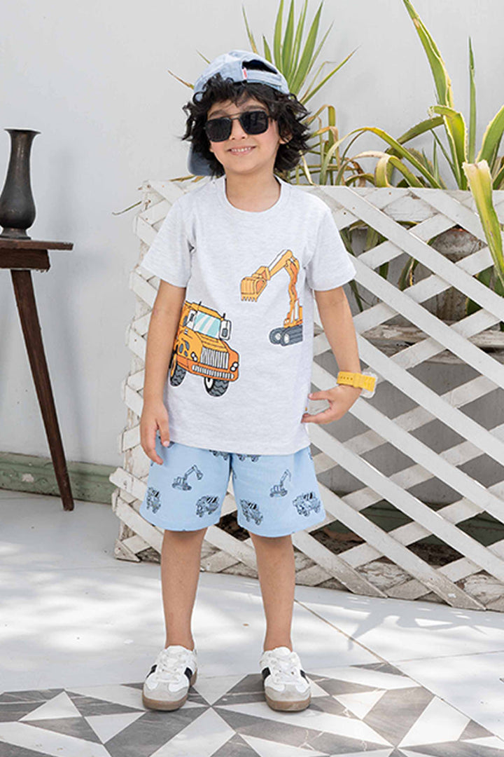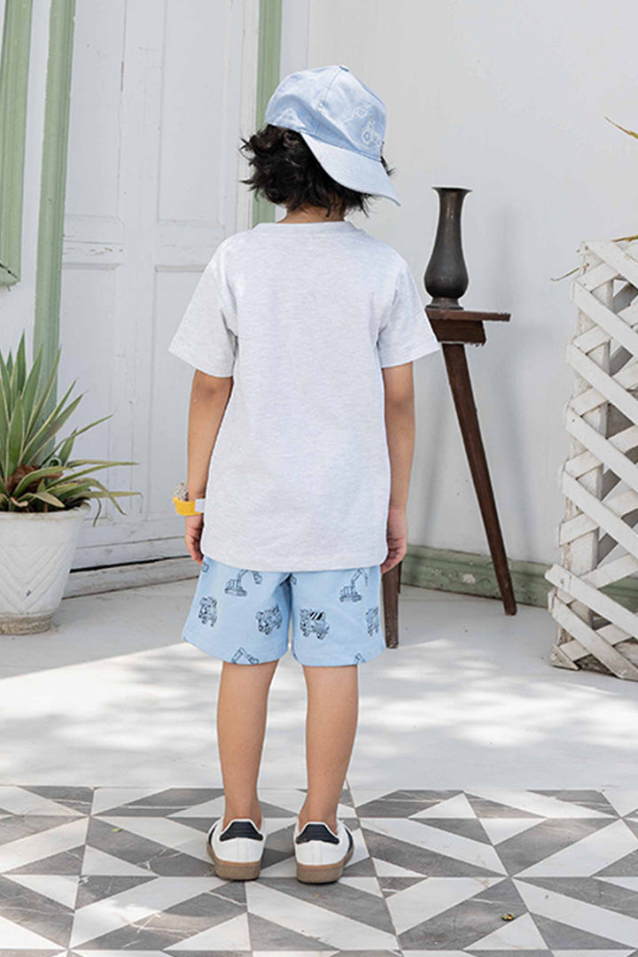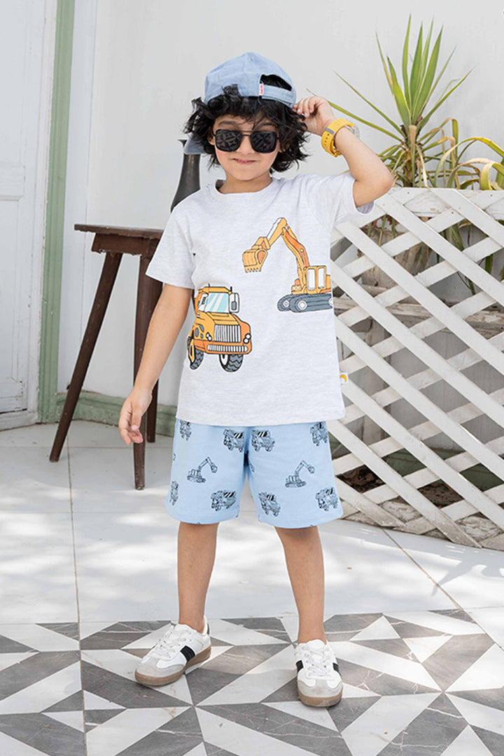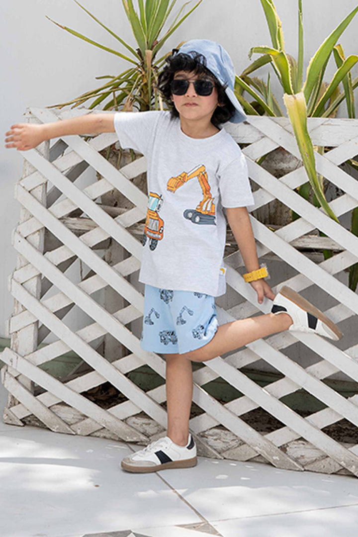 Fuel your child's imagination with our little builder construction set! Featuring a soft grey t-shirt printed with a bright yellow excavator and dump truck, and matching blue shorts covered in playful construction vehicle prints, this outfit is Ideal for young truck lovers.