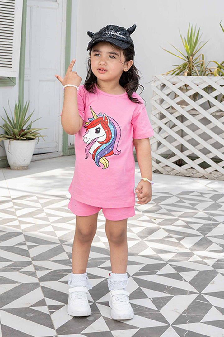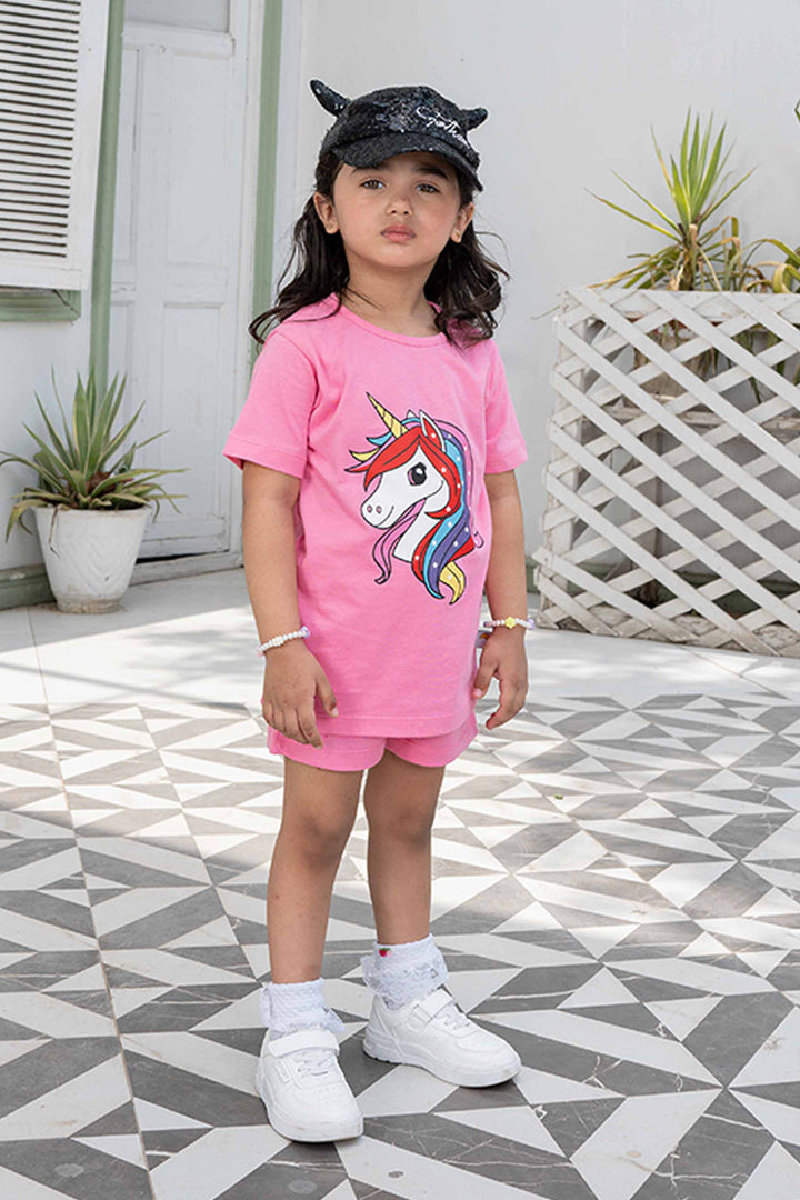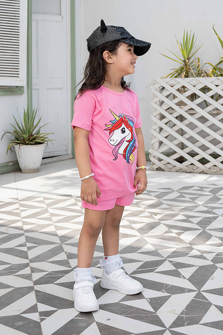 Bottoms: Matching light pink shorts with a unicorn graphic.