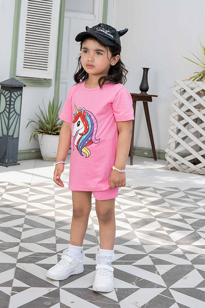 Top: Light pink short-sleeve t-shirt featuring a large, colourful unicorn graphic on the front. The unicorn has a rainbow-coloured mane and a golden horn.